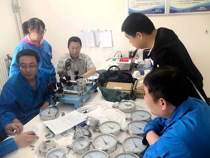 “你看,你這個地方沒有纏生料帶,因為壓力表在使用過程中螺紋有細小的磨損,裝上之后并沒有嚴格密合,因此會漏氣,所以你加半天都從這漏掉了”,李薇靜這才恍然大悟,便拆下壓力表纏上生料帶,壓力表指針才根據加壓慢慢擺動。 站在一旁的李耀華看的也躍躍欲試,說:“讓我也操作一下吧”,安裝壓力表,轉動手輪、微調,每到一個測量刻度讀數,做好筆記,填寫校驗合格證,粘貼合格證,一步一步,嚴格按照步驟操作,做的游刃有余,很快20多塊壓力表已經校好!鞍パ健,突然一聲大叫,打斷了大家,只見連接管處水呲一下全噴了出來,“怎么回事,怎么回事”,李耀華著急地問道,“沒關系,是你校完之后壓力沒有完全泄掉,壓力導致水呲出來了”說著老師完全打開了泄壓手輪。 “一個看似簡單的壓力表校驗并不那么容易啊,有很多需要注意的細節”,任亮亮感慨道。通過培訓,大家的業務水平有了提升,以后工作中也更有責任心,設備檢修校驗中不放過每個細節,為機組正常運行做好維護工作。