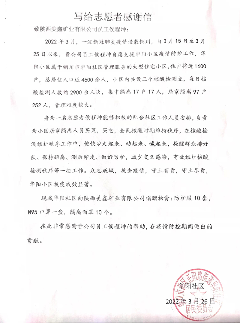3月14日,“新冠病毒”疫情的突襲,使整個銅川按下了暫停鍵。防控形勢驟然緊張,防控工作壓力驟增。關鍵時刻,公司黨委發(fā)出倡議,號召廣大黨員干部積極發(fā)揮先鋒模范作用,主動投身疫情防控工作,礦業(yè)公司的侯程坤積極響應號召,成為眾多“逆行者”中的一員。 “疾風知勁草,危難顯擔當”,我為防“疫”出把力。 侯程坤,男,1994年5月1日出生,目前在礦業(yè)公司供銷部從事磅房管理工作。據了解,疫情發(fā)生時侯程坤正在家中輪休,當他得知公司黨委的號召后,經與父母短暫溝通后,便立即向當地社區(qū)提出申請,義無反顧的加入到“疫情防控”志愿者隊伍當中。在問道他為什么要參加此次志愿者防疫工作時,他淡淡的說到:“在國家危難之際,作為一名國有企業(yè)職工,代表我們企業(yè)為防疫工作出一點力,我感到非常榮幸...” “疫情就是命令,防控就是責任”,做好每家住戶的防疫工作是我的責任。 在此次疫情防控工作中,按照當地社區(qū)對志愿者的工作分配,侯程坤同志被分配到銅川市新區(qū)疫情較為嚴重的華陽小區(qū)工作。作為我市建設較早的一批小區(qū),華陽小區(qū)有著顯著的特點,小區(qū)大,住戶雜,90%的樓宇目前還沒有安裝電梯,導致防疫工作在物資運送、通知核檢、維護秩序等工作上增加了不少困難。面對華陽小區(qū)的實際情況和困難,志愿者們勇敢的扛起了責任,每天天不亮,侯程坤就戴上N95,穿上防護服趕到社區(qū),根據工作安排,和大家一起忙碌著。與侯程坤一起工作的志愿者是這樣描述他的,“此次抗擊疫情,小候同志表現(xiàn)得非常出色。在通知住戶核酸檢測上,侯程坤每天天微微亮就開始按樓號通知大家下樓做核酸檢測,維護秩序。為防止有住戶漏掉,他就一家一戶的敲門通知,做到了人人核酸檢測。住戶做完核酸檢測后,他又開始對小區(qū)住戶需要的生活用品、糧油蔬菜等進行分揀,然后馬不停蹄的將物品挨家挨戶送上門。在配送過程中當遇到住戶有需求和困難時,他也能及時反饋并積極解決,真是個非常不錯的小伙子!” “隨時待命,勇當先鋒”,時刻牢記責任與擔當。 隨著疫情形勢的逐漸好轉,銅川市也積極有序推進復工復產。在此次疫情防控工作中我們要向參與防疫的醫(yī)務人員、志愿者表示由衷的感謝,是他們用實際行動為大家筑起了一道道健康的“防火墻”,守護著我們的安全。當問道侯程坤在此次“抗擊疫情”中有什么感悟時,他答到:“雖然志愿服務結束了,但這次的經歷對我來講卻是一次非常難得的錘煉,雖然付出了很多的汗水,但是當我看到華陽小區(qū)生活秩序得到穩(wěn)定恢復,自己也受到了華陽社區(qū)的表揚和認可時,我覺得一切付出都是值得的。如若有一天,國家、社會和我們企業(yè)再一次需要我,我仍將義無反顧的投身第一線,用實際行動來證明國有企業(yè)職工的責任和擔當。” |
